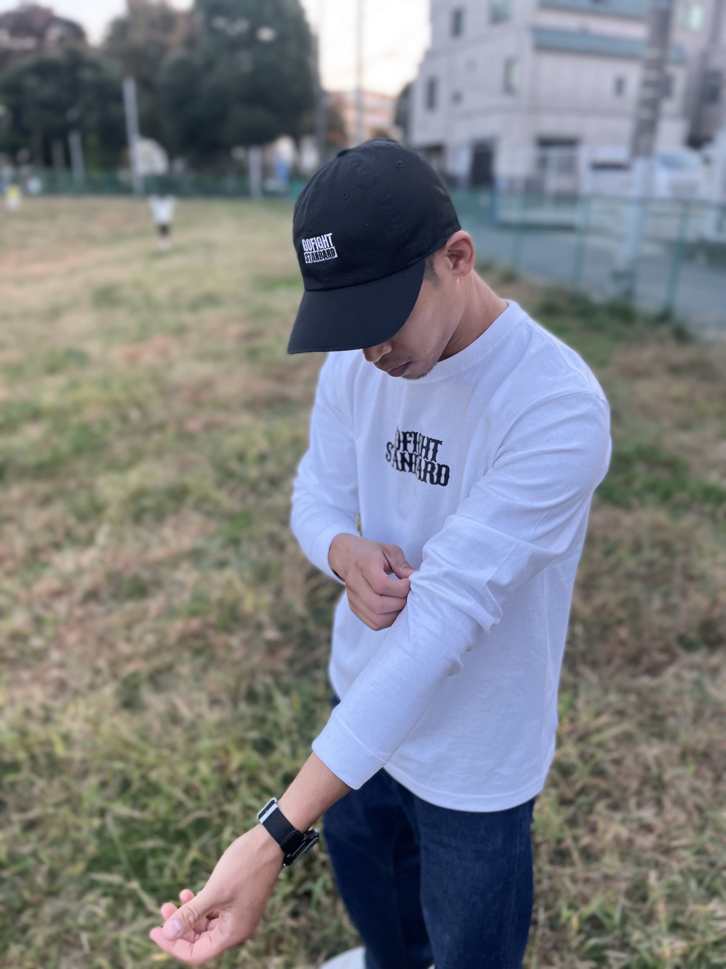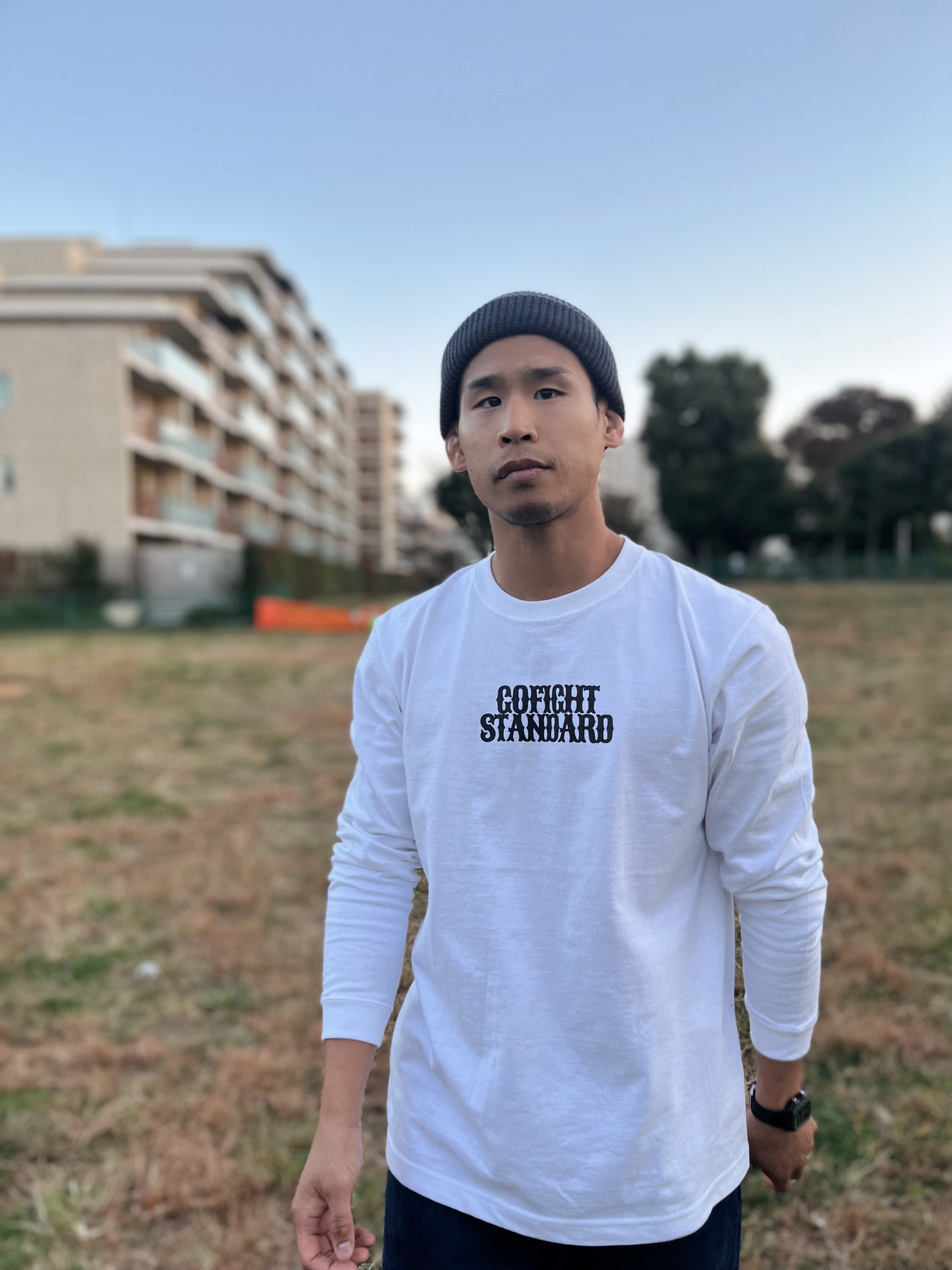 GOFIGHT STANDARDの文字をストリートライクな字体で胸元にシンプルに配置。